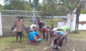 PORTALINDO.CO.ID, Timika ~ Dalam rangka menjaga kebersihan dan kerapian lingkungan, Babinsa Koramil 1710-07/Mapurujaya Sertu Tangkas Budiono bersama Bhabinkamtibmas dan masyarakat melaksanakan kerja bakti pembersihan Taman Keanekaragaman Hayati Mapurujaya yang berada di Jl. Poros Pomako, Kampung Muare, Distrik Mimika Timur, Kabupaten Mimika, Minggu (9/6/2024).
