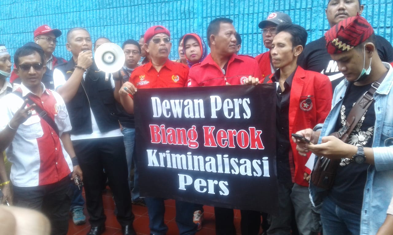 “Dewan Pers tidak independen, kami sebagai insan pers merasa dikriminalisasi. Rekomendasi dewan pers mengancam kemerdekaan pers dan melanggar UUD No.40 tahun 1999 Tentang PERS. Karenanya kami minta dewan pers ini Ketuanya Dipecat dan dibubarkan saja,” tegas korlap aksi dari organisasi Wartawan.