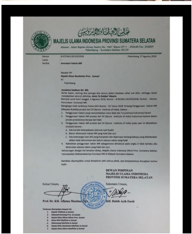 yang isinya Merujuk Suat kami tanggal 5 Agustus 2018 Nomor: B-95/MUI-SS/VIII/2018 Perihal penundaan imunisasi MR. Mengingat telah terbitnya Fatwa MUI Nomor: 33 tahun 2018 tentang penggunaan MR (Measles Rubella) produk dari SII (Serum Institute Of India) bahwa: (1) Penggunaan vaksin yang memanfaakan unsur Babi dan turunannya hukumnya haram, (2) Penggunaan vaksin MR produk SII ( Serum Institute of India) hukumnya dengan karena dalam proses produksinya berasal dari Babi, (3) Penggunaan vaksin MR produk dari SII (Serum Institute of India) pada saat ini dibolehkan (Mubah) karena (a) ada kondisi keterpaksaan (darurat syar’iyyah) , (b) Belum ditemukan vaksin MR yang halal dan suci, (c) ada keterangan dari ahli yang kompeten dan dipercaya tentang bahaya yang ditimbulkan akibat tidak diimunisasi dan belum adanya vaksin yang halal dan suci. (4) Kebolehan penggunaan vaksin MR sebagaimana yang dimaksud pada angka 3 tidak berlaku jika ditemukan adanya vaksin yang halal dan suci, terangnya.