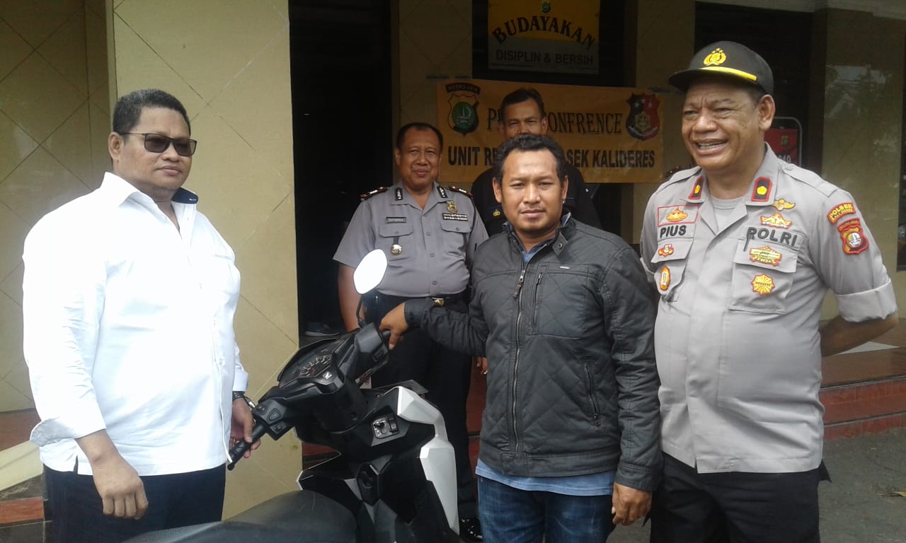 Usai pers confrence Kapolsek Kalideres Kompol Pius SH yang didampingin Kanit Reskrim AKP Syafri Wasdar SH menyerahkan sepeda motor kepada pemiliknya, Amin (40) yang hilang sejak tanggal 11 Januari lalu.
