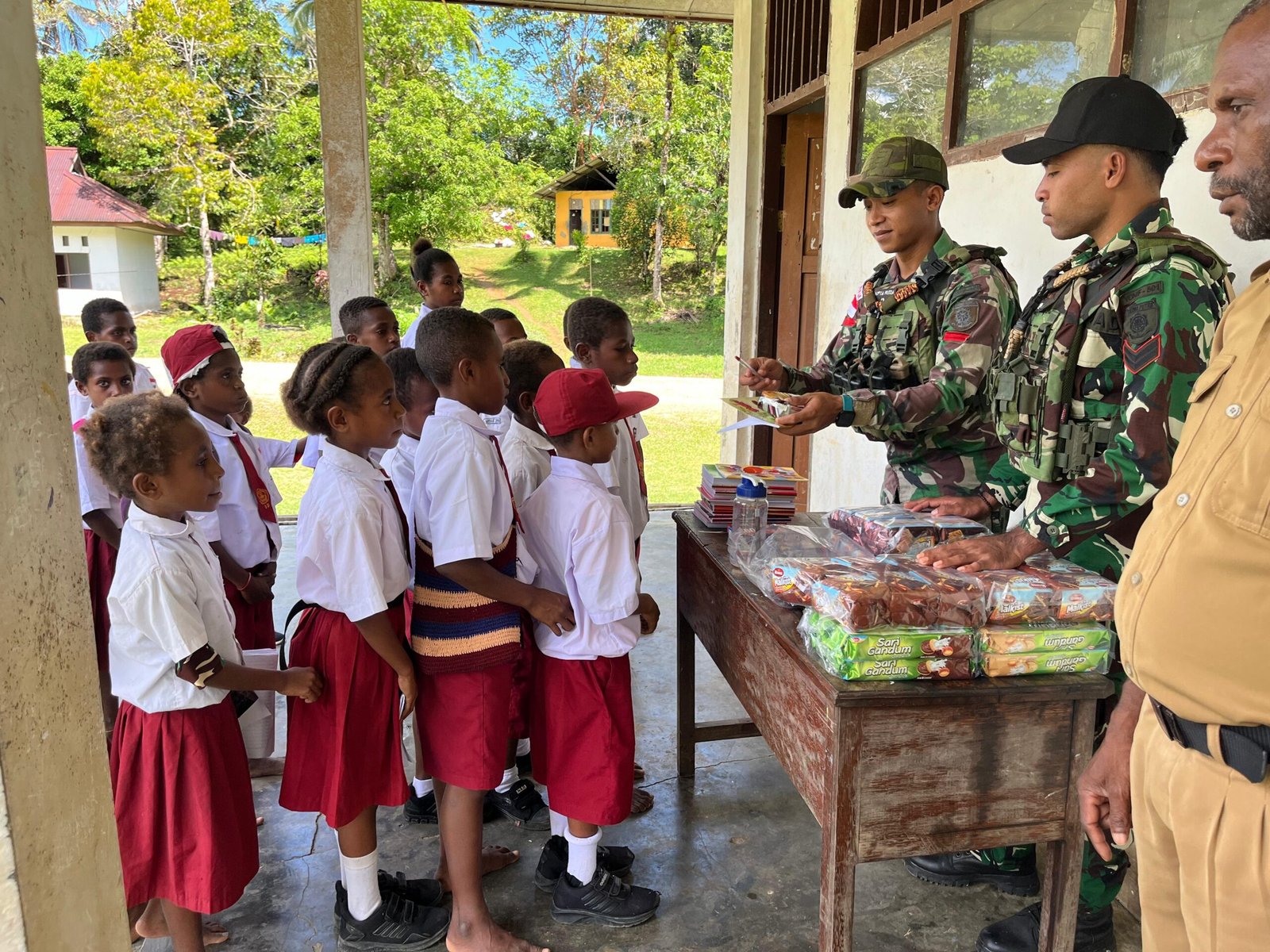 Dengan tetap mengutamakan keamanan selama kegiatan, interaksi komunikasi yang harmonis antara para Prajurit TNI dengan para warga semakin terjalin dengan inisiatif pembagian alat-alat tulis dan kue kepada para siswa. Kegembiraan anak-anak langsung terlihat dari senyum dan tawa lebar sesaat setelah menerima pemberian cuma-cuma para Prajurit TNI termasuk Andre Fatemyo, yang menyampaikan terima kasih atas kepedulian Prajurit TNI.