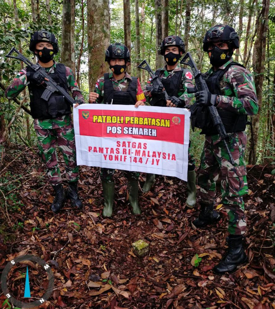 Anggota Satgas Yonif 144/JY Melaksanakan Patroli Patok di Perbatasan RI-Malaysia