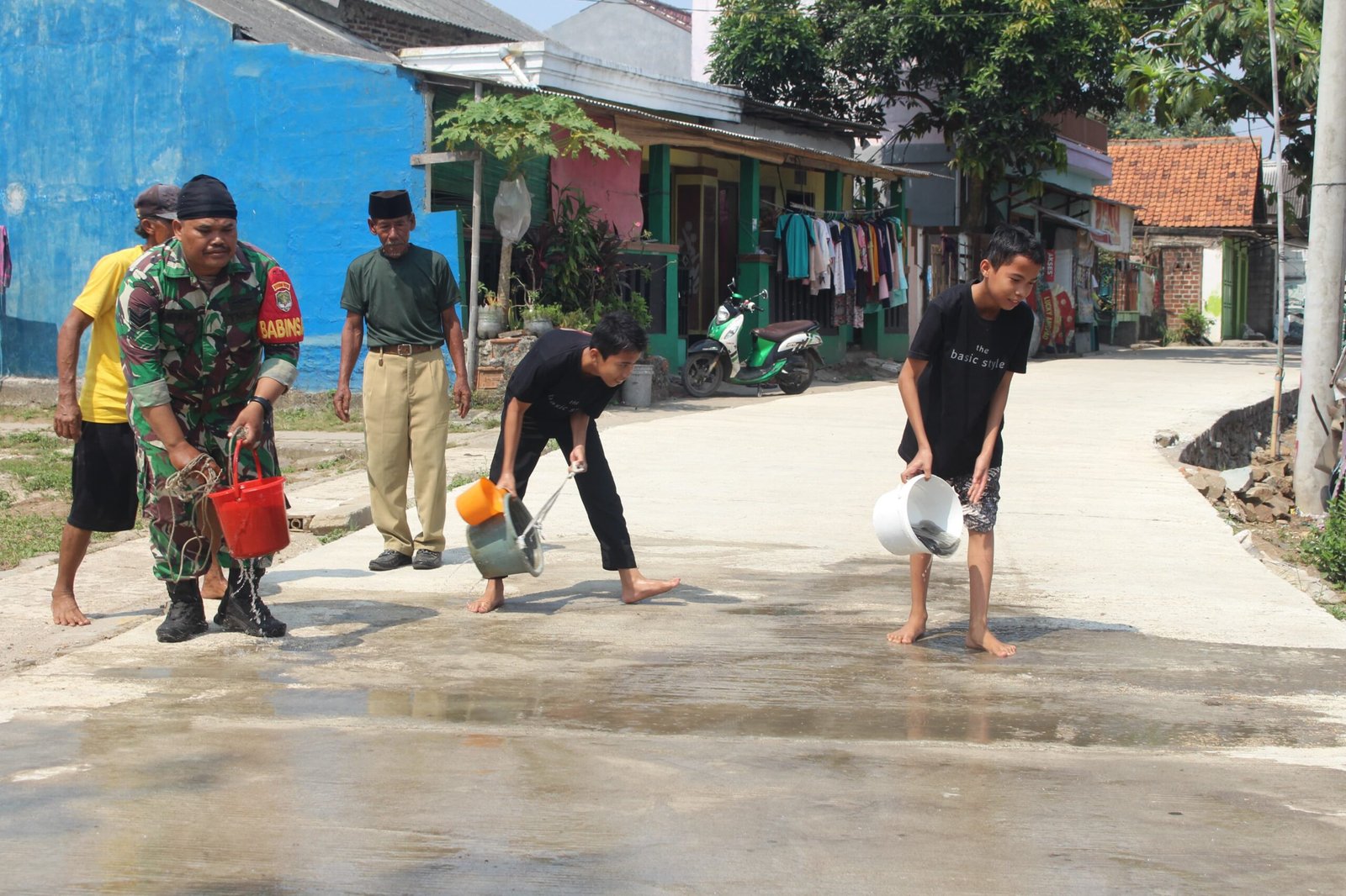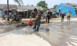 PORTALINDO.CO.ID, Kodam Jaya – Tigaraksa Terlihat antusias warga Gintung bergerak membantu Babinsa basahi jalan desa Gintung Kec.Sukadiri Kab.Tangerang Kamis (6/6/2024)