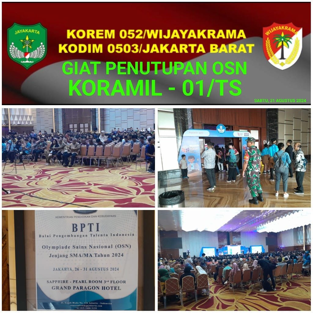 PORTALINDO.CO.ID | Kodam Jaya, Jakarta Barat_Giat Penutupan OSN ( Olimpiade Sains Nasional ) Tahun 2024 berlangsung di Ballroom Hotel Grand Paragon Lantai 7 Jalan Gajah Mada No. 126, Kelurahan Keagungan, Kecamatan Tamansari Jakarta Barat pada Sabtu, 31 Agustus 2024.