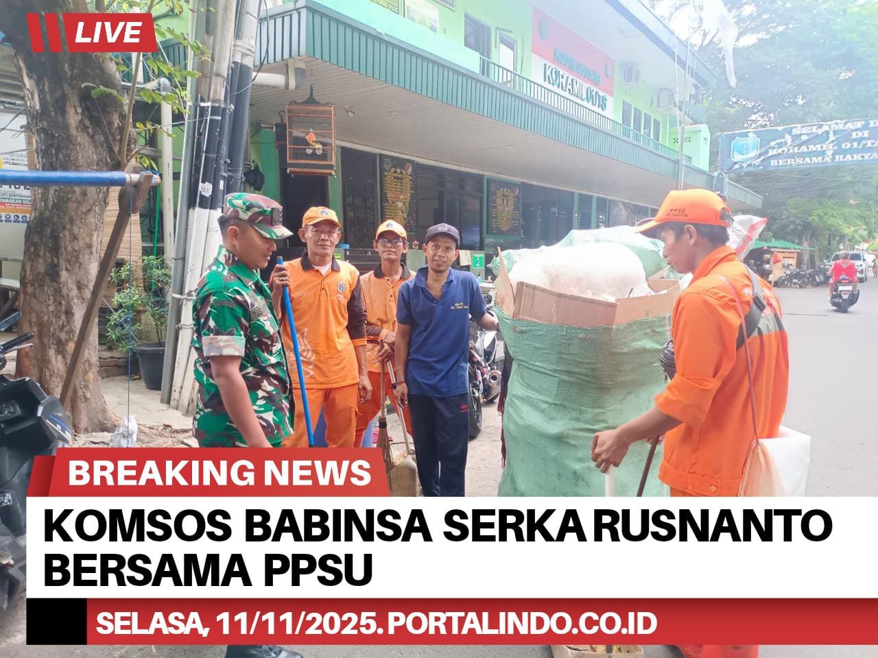 Portalindo.co.id | Kodam Jaya, Jakarta Barat _ Sebagai bentuk sinergi untuk menjaga dan meningkatkan kebersihan serta keamanan lingkungan di wilayah, Babinsa Serka Rusnanto sambangi personil PPSU di lokasi giat Karya bakti, guna melakukan Komunikasi Sosial (Komsos). Selasa, (11/11/2025).