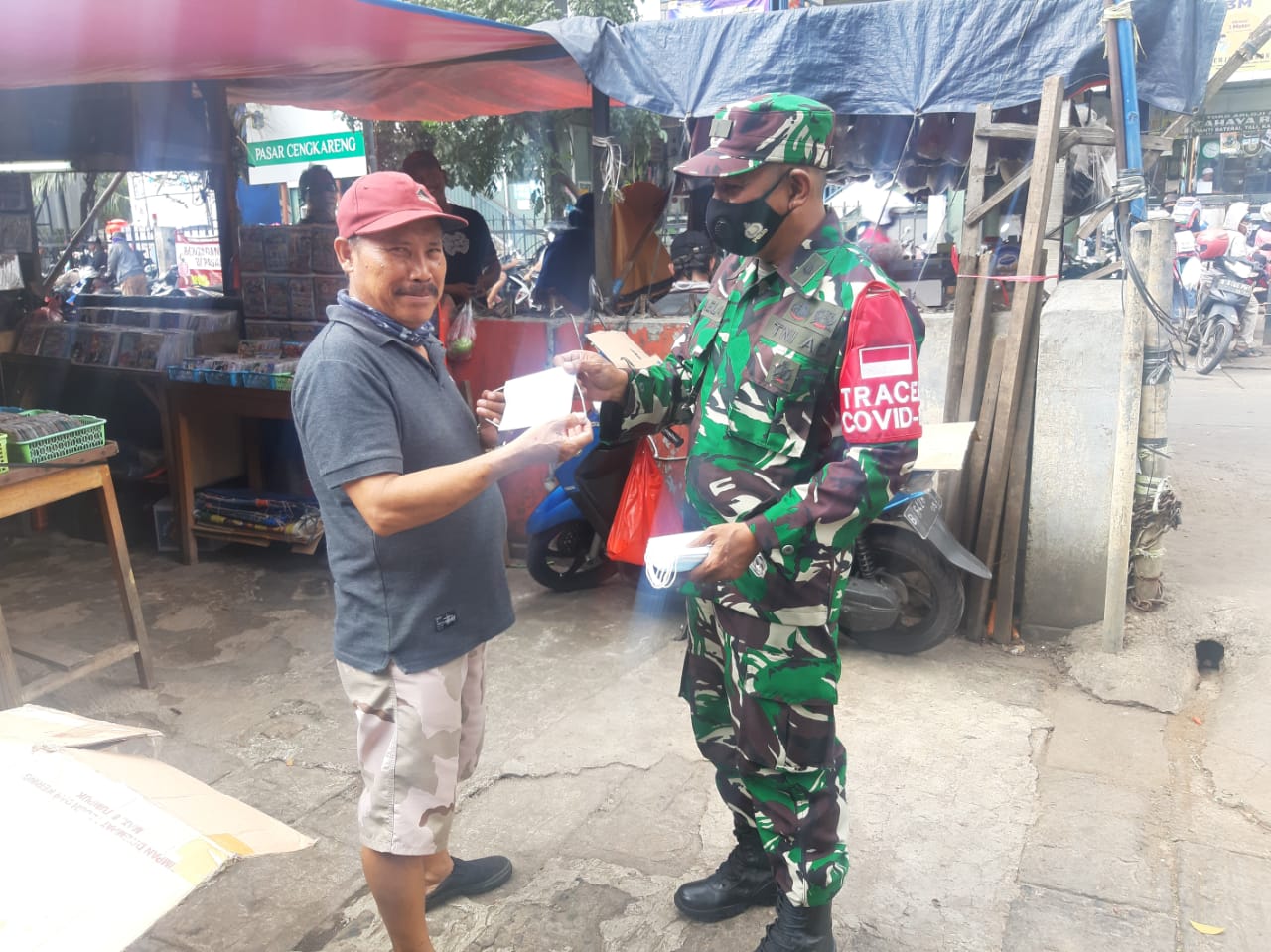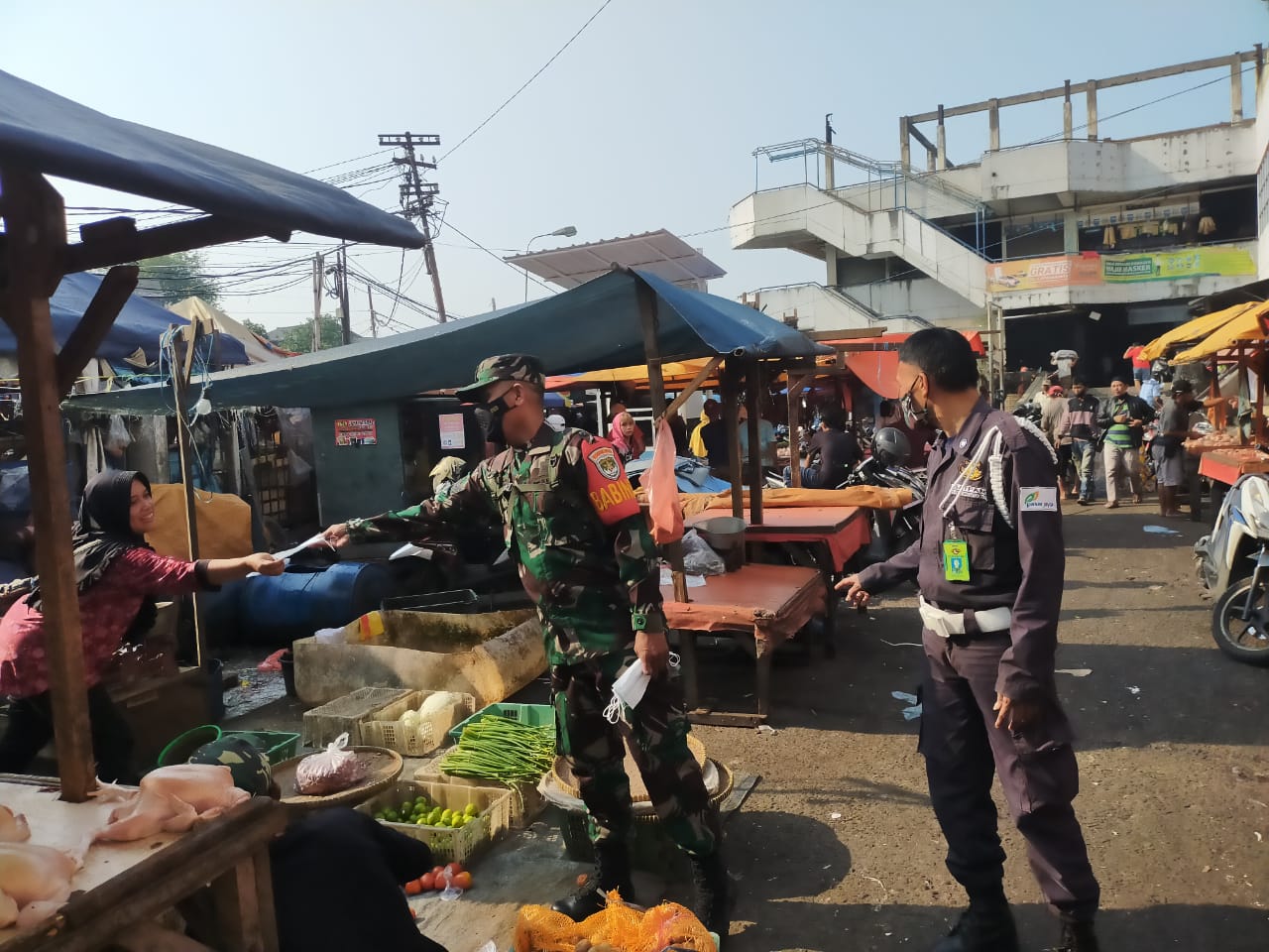 PORTALINDO.CO.ID, Jakarta – Babinsa Koramil 04 Cengkareng Kodim 0503 Jakarta Barat, Pelda M Jaelani dan Sertu Selamet yang di bantu Security Pasar memberikan himbauan sekaligus membagikan masker kepada para pedagang maupun pengunjung PD Pasar Jaya Cengkareng, Jalan Bangun Nusa Raya, Rt. 002, Rw.02, Kel. Cengkareng Timur, Kec. Cengkareng, Jakarta Barat. 22 April 2021, Pukul 09,00 Wib.
