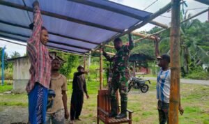 PORTALINDO.CO.ID | Yapen ~ Sebagai bentuk perhatian dan kepedulian terhadap salah satu warga binaan yang akan melaksanakan Ibadah syukuran keluarga, Babinsa Koramil 1709-01/Serui Praka Romelus Karowa bersama warganya memasang tenda di rumah Bapak Manuel Aroma, yang berlokasi di Kampung Ariepi I, Distrik Kosiwo, Kabupaten Kepulauan Yapen, Sabtu (15/6/2024).