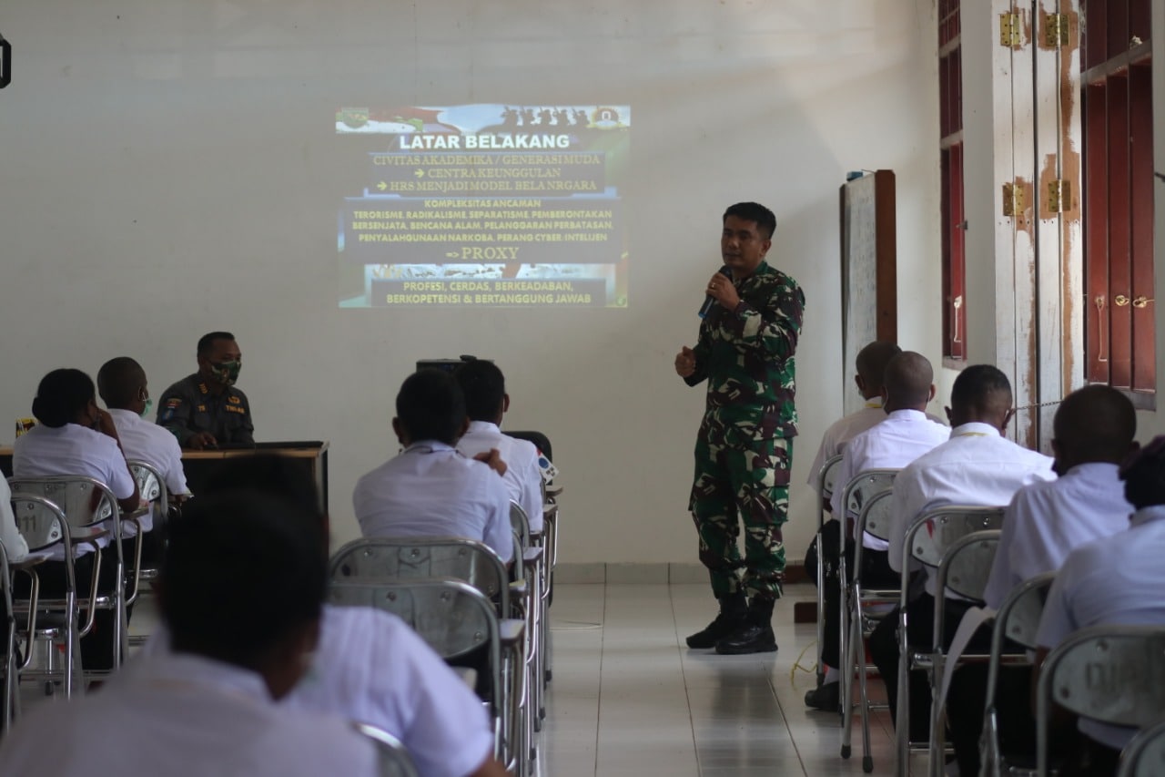 Pada kesempatan ini Dandim menjelaskan tentang Bela Negara yang merupakan sikap dan perilaku warga negara, yang dijiwai oleh kecintaan kepada NKRI yang berdasarkan Pancasila dan UUD 1945, dalam menjamin kelangsungan hidup bangsa dan negara.