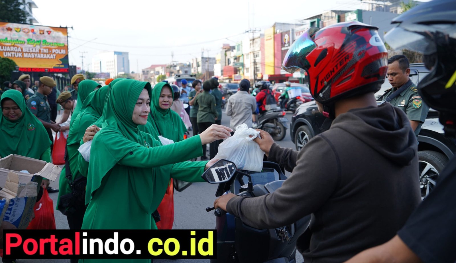 Portalindo.co.id | Palembang _ Menjelang waktu berbuka Puasa Ramadhan, Keluarga Besar TNI – Polri Garnizun Palembang yang terdiri dari personel Kodam II/Swj, Lanal, dan Lanud SMH Palembang bersama Kepolisian Jajaran Polda Sumsel serta Ibu-ibu Dharma Pertiwi, membagikan Takjil Buka Puasa Kepada Masyarakat pejalan kaki dan pengendara sepeda motor, para sopir dan penumpang angkutan umum yang melintas di Jalan Jenderal Sudirman depan Makodam II/Sriwijaya Kota Palembang, Kamis (27/03/2025), sore.