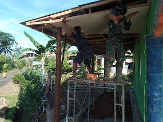 Terlihat di lapangan, anggota Satgas dan warga bahu membahu menyelesaikan pengerjaannya berpacu dengan cuaca untuk menyelesaikan renovasi Musholla Muthmainnah di Desa Suato Baru.