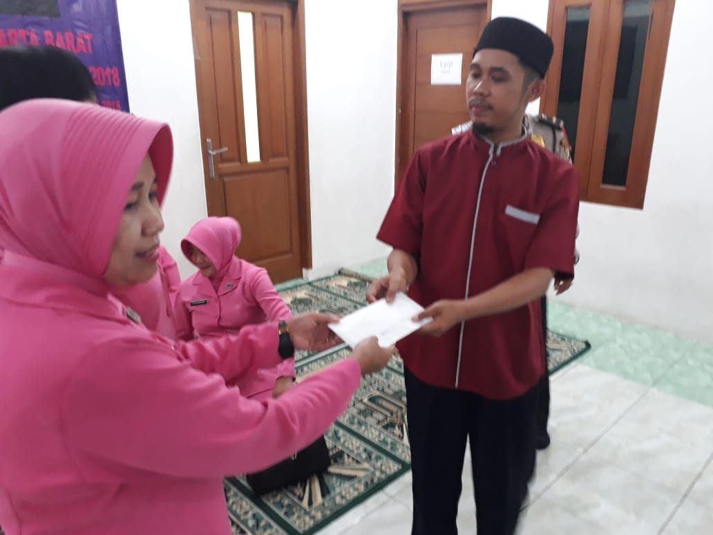 Usai memberikan sambutan, Bhayangkari unit Polsek Kembangan memberikan santunan sebanyak 28 anak yatim dan juga memberikan Sumbangan sembako.(Team)
