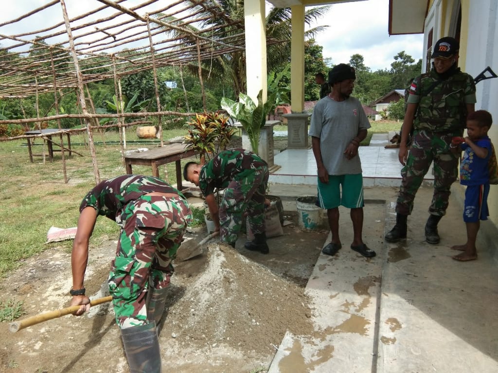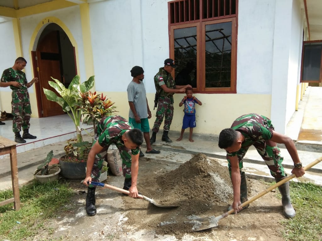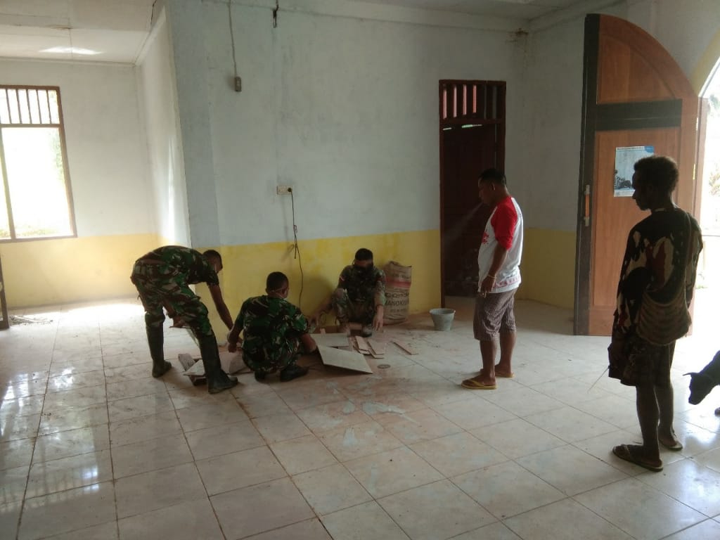 PORTALINDO.CO.ID,PAPUA – Anggota Satgas Pamtas Yonif 725/Woroagi Pos Ubrub yang dipimpin oleh Sersan Satu Harnono bersama 6 orang anggotanya dan jemaat Gereja melakukan pembangun perbaikan Gereja ST Bonifasius KKT di Kampung Ubrub, Distrik Web, Kabupaten Keerom. Selasa, (14/5).