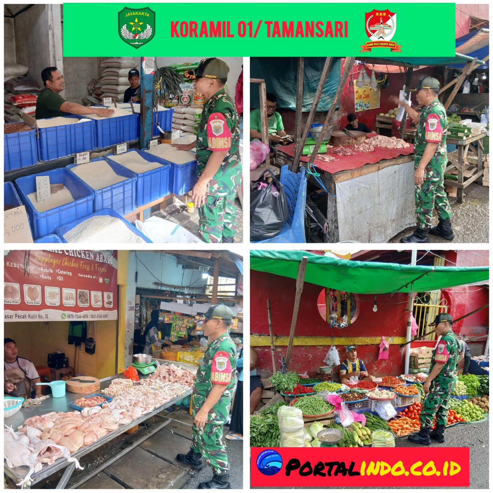 Portalindo.co.id | Kodam Jaya, Jakarta Barat _ Babinsa Koramil 01/Tamansari Kodim 0503/JB, Peltu Erwin turun ke Pasar Pecah Kulit Jalan Mangga Besar XI, Kelurahan Pinangsia Kecamatan Tamansari Jakarta Barat untuk mengadakan pengecekan harga dan monitoring situasi keamanan dan kebersihan pasar. Rabu (12/11/2025).