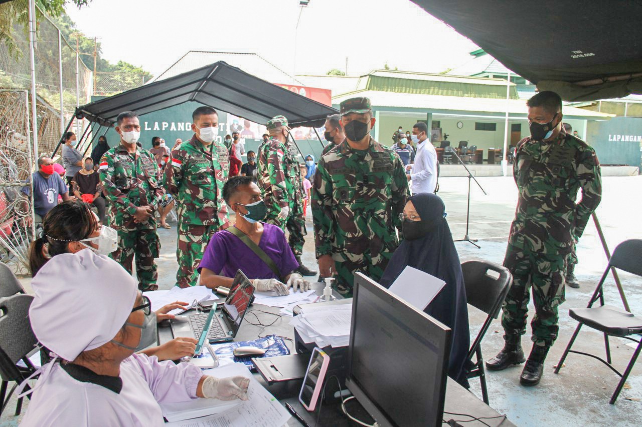 PORTALINDO.CO.ID JAKARTA – Komandan Korem (Danrem) 172/PWY Brigjen TNI Izak Pangemanan beserta Komandan Lanud Silas Papare Marsma TNI Budi Achmadi didampingi oleh Kasiops Korem 172/PWY Kolonel Inf Josep D.D Surbakti, S.E., dan Dandim 1701/Jayapura Kolonel Edwin Apria Chandra, S.E., meninjau Serbuan Vaksinasi gelombang kedua tahap satu TNI-Polri dan Pemerintah Kota Jayapura yang dipusatkan di Lapangan Tenis Asrama Bucend III Waena, Sabtu (17/7/2021).