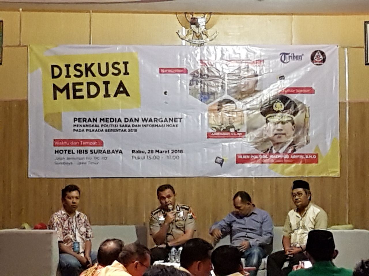 Diskusi media kali ini menghadirkan pembicara dari Kadiv Humas Polda Jawa Timur Kombes Pol F.Barung Mangera,S.I.K, tokoh media Tribunjatim.com Adi Sasono, dan Pakar Cyber M. Sururi serta Divisi Hukum dan Penindakan Pelanggaran Bawaslu Jawa Timur Toto Hariyono, ucap I.N.Bintare Prayudi Ketua DPP PERADAH Jawa Timur. Yudi panggilan akrabnya, menyampaikan, diskusi Media ini merupakan wujud peran serta Peradah Jatim untuk bersama – sama memerangi maraknya isu Hoax dan mensukseskan Pilkada Serentak 2018 tanpa politisasi SARA.