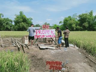 Proses pembangunan yang di kerjakan oleh PT Dwi Pilar Pratama tersebut, di hentikan oleh puluhan warga lantaran tidak adanya sosialisasi ke warga sekitar, serta belum di kantonginya surat ijin .