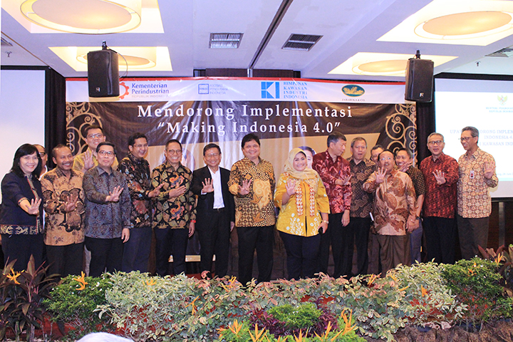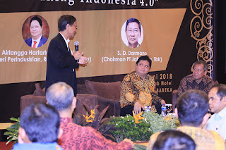 Menteri Perindustrian Airlangga Hartarto memberikan paparannya saat menjadi narasumber pada diskusi dengan pimpinan perusahaan kawasan industri dan pengelola kawasan industri Jababeka di Cikarang, Jawa Barat, 26 Juni 2018. Dalam paparannya, Menperin mengatakan bahwa implementasi industri 4.0 mampu meningkatkan produktivitas, penyerapan tenaga kerja, dan perluasan pasar bagi industri nasional. Namun, peluang yang ditimbulkan tersebut perlu membutuhkan keselarasan dengan perkembangan teknologi dan seperangkat keterampilan baru.
