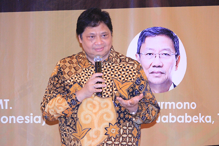 Nasional – Menteri Perindustrian Airlangga Hartarto bersama moderator Wakil Rektor Bidang Kemahasiswaan Dwi Larso memperhatikan paparan dari Dirut PT Jababeka Tbk Setyono Djuandi Damono saat menjadi narasumber pada diskusi dengan pimpinan perusahaan kawasan industri dan pengelola kawasan industri Jababeka di Cikarang, Jawa Barat, 26 Juni 2018. Pada kesempatan tersebut, Darmono menyatakan siap mendorong implementasi industri 4.0.