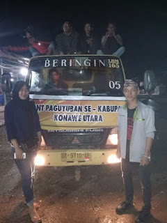 pukul:02:30 WITA rombongan mahasiswa front paguyuban mahasiswa se Kabupaten konawe Utara melanjutkan perjalanan menuju lokasi bencana banjir, dengan menggunakan dua buah kendaraan mobil damp truck,dan satu buah mobil dump truck tersebut bermuatan penuh sembako sebagai donasi untuk korban banjir konawe Utara.