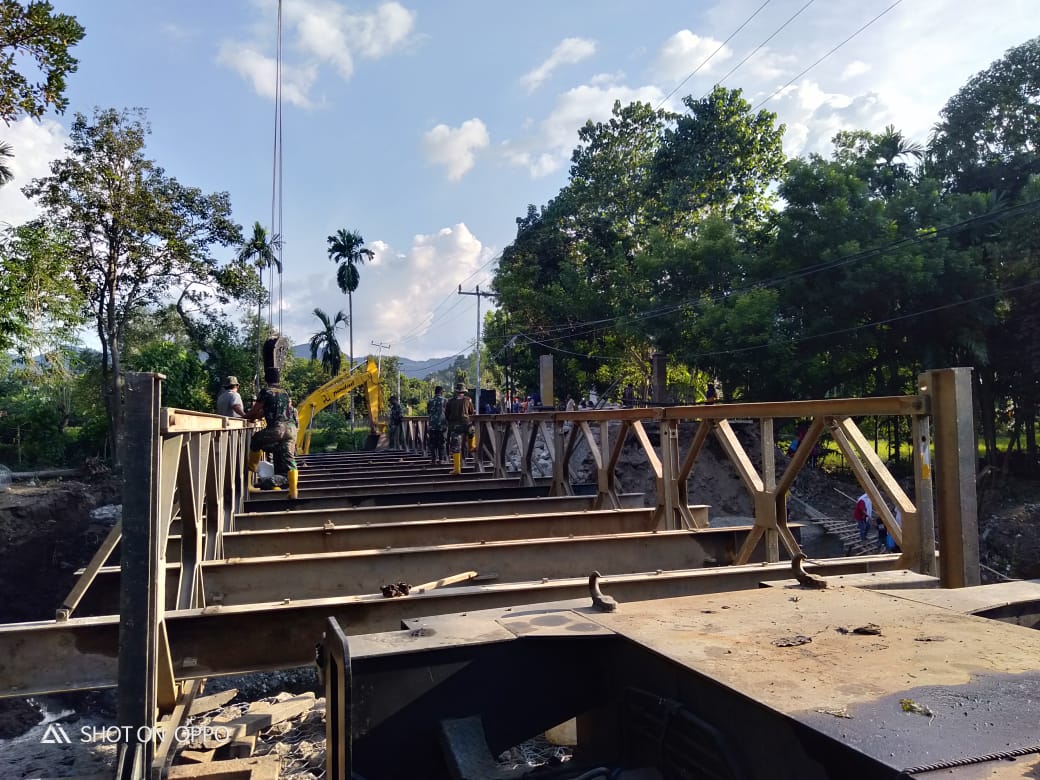 “Pada hari kedelapan ini kami telah menyelesaikan pembuatan pangkal jembatan, dan akan dilanjutkan dengan pemasangan Jembatan Acrow Panel. Diharapkan dalam waktu dua ke depan, seluruh badan jembatan telah selesai dan sudah dapat dilalui kendaraan roda empat maupun roda dua, ” ujar Letkol Czi Alid Setiawan, Danyonzikon 13/KE.