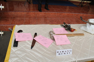 Barang bukti yang diamankan antaranya Plang warna putih yang bertuliskan kepemilikan, serpihan pagar yang dirusak, palu besar dan linggis untuk merusak pagar, dua buah senjata tajam jenis pisau dan golok, dan satu unit mobil.