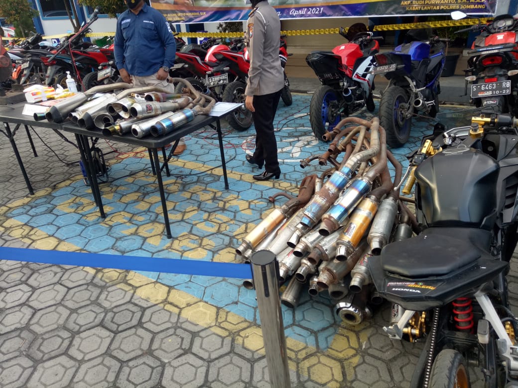 Petugas menyita knalpot yang tidak standar dan tidak boleh digunakan karena tingkat kebisingan yang sudah meresahkan masyarakat serta pengguna jalan raya”, tutur Kapolres saat pimpin Konferensi Pers. Selasa (27/4/2021).