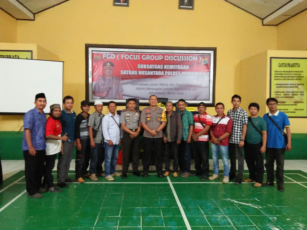 Sulawesi Tengah,Portalindo.co.id – Berbagai upaya menangkal paham radikalisme dan penyebaran berita hoax terus digalakkan pihak kepolisian. Salah satunya dengan menggelar FGD (Focus Group Discussion) melalui Subsatgas Kemitraan Satgas Nusantara Polres Morowali, pada Kamis, 31 Mei 2018.