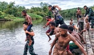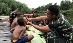 PORTALINDO.CO.ID – TNI menjadi sahabat anak, Satgas Pamtas Kewilayahan Yonif 125/SI’MBISA Pos Venaha menjalin keakraban dengan anak-anak Papua sambil bermain dan menikmati suasana sungai di Kampung Sahapikiya, Distrik Venaha, Kabupaten Mappi, Kamis (13/6/2024).