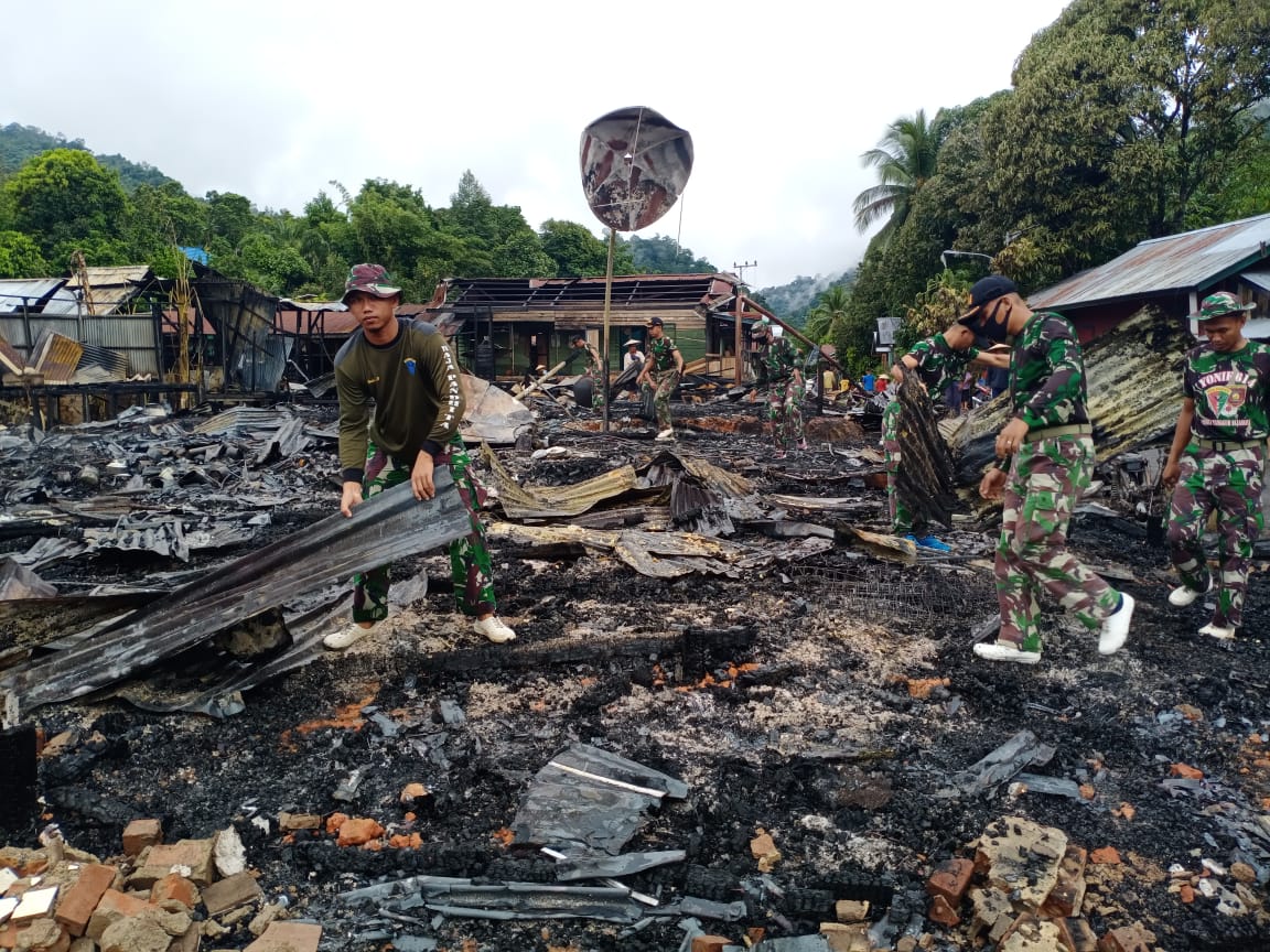 Lebih lanjut disampaikannya, keesokan harinya (Rabu, 26/5/2021) personel Satgas bersama Babinsa, Bhabinkamtibmas, dan warga menggelar gotong royong membersihkan puing-puing bangunan yang terbakar.