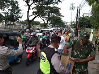 Kegiatan dipimpin oleh Kapolsek Metro Cempaka Putih Kompol Rosiana dan Wadanramil 06/ Cempaka Putih Lettu Czi Sefanye Banik, membagikan puluhan air mineral dan kue untuk para pengendara.