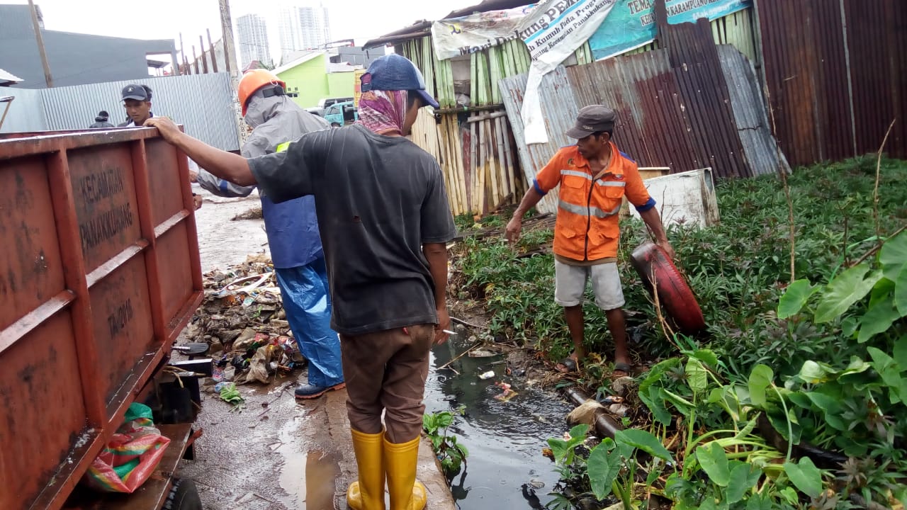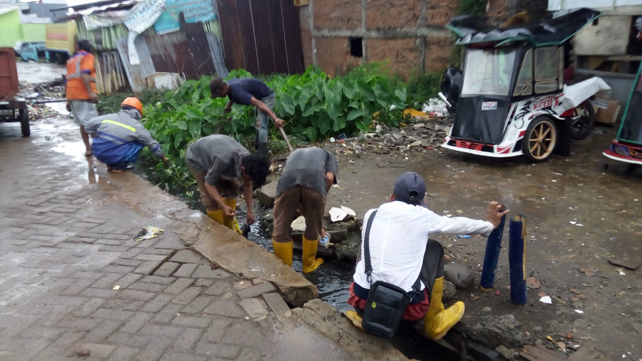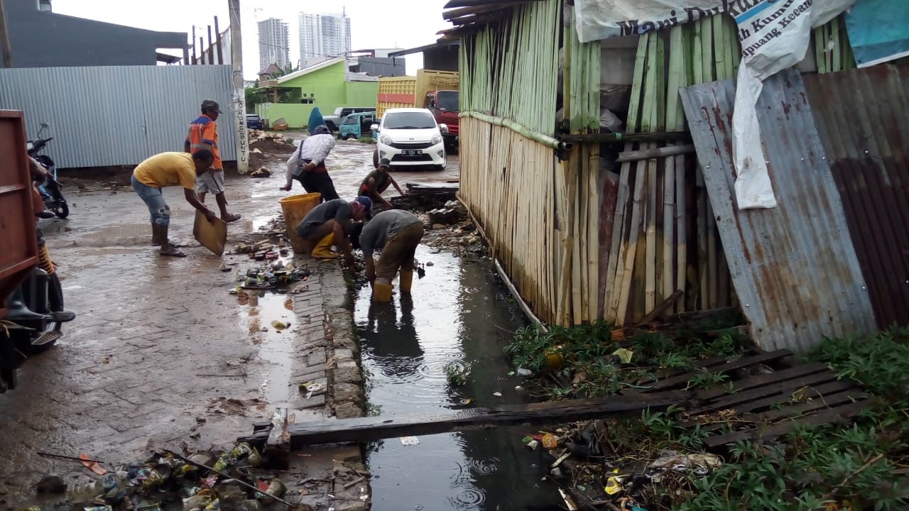 Meski cuaca sedang hujan semangat para petugas kebersihan dalam mewujudkan Makassar Tidak Rantasa tidak tergoyahkan.