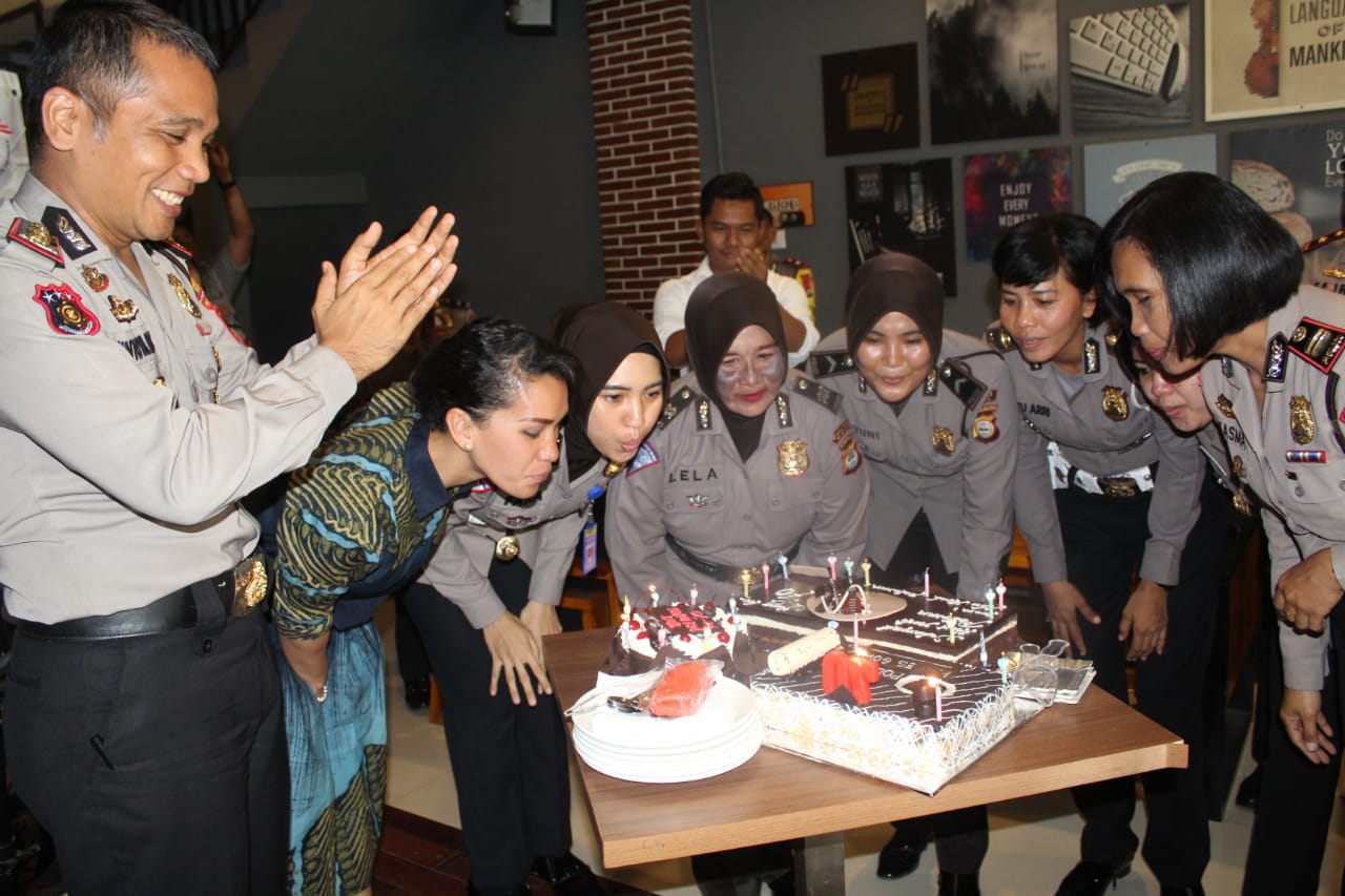 Kegiatan pun dilanjutkan dengan acara tiup lilin dan potong kue bersama, dimana potongan kue pun diberikan secara simbolis oleh Kapolres Gowa dan Ibu Asuh Polwan kepada perwakilan Polwan termuda dan tertua.