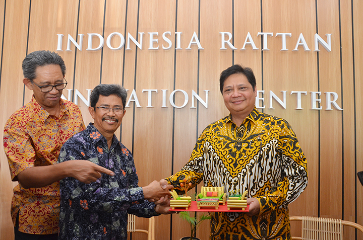 Menteri Perindustrian Airlangga Hartarto menerima cinderamata yang diserahkan oleh Kepala PIRNAS Andi Tanra disaksikan oleh Direktur Jenderal Ketahanan dan Pengembangan Akses Industri Internasional Kemenperin I Gusti Putu Suryawirawan saat mengunjungi Pusat Inovasi Rotan Nasional, Palu, 20 April 2018. (Rilis)