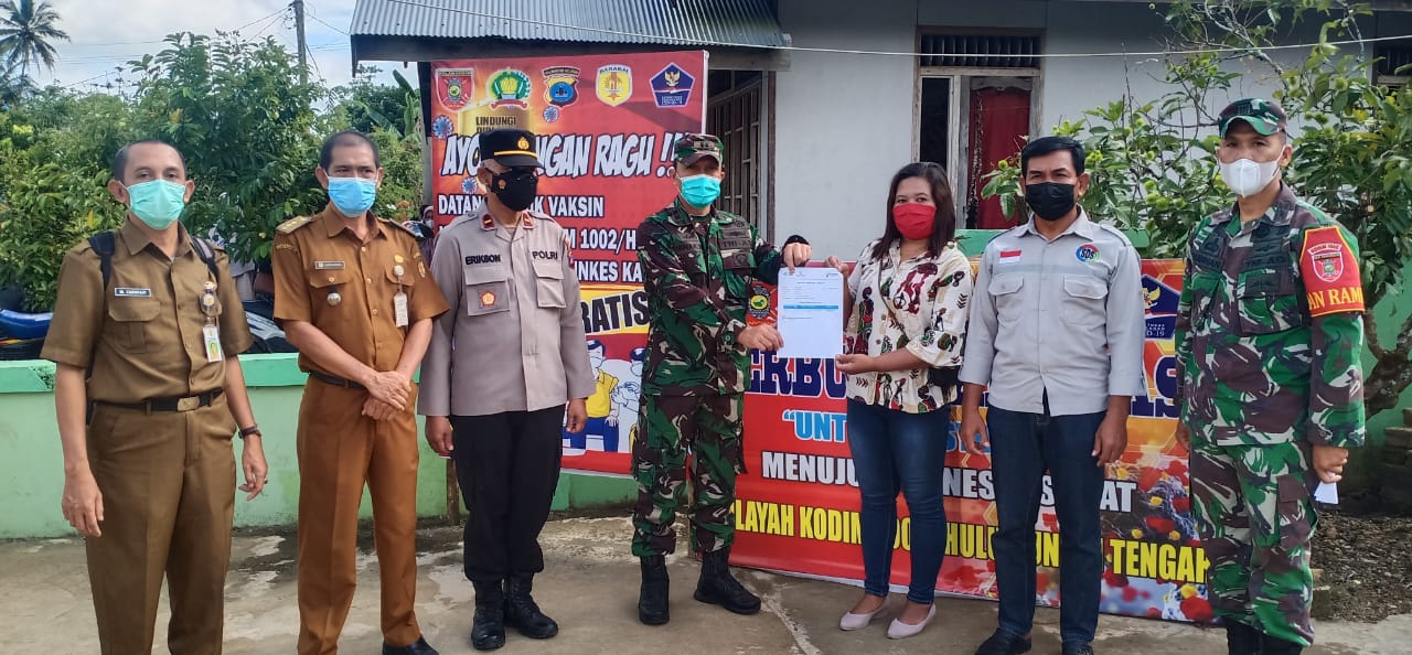 Dandim 1002/HST Letkol Inf Muh Ishak. HB didampingi oleh Danramil 1002-01/BAS Kapten Inf Subhan, Camat BAS Kartidupra,Sp. Kapuskes Birayang M. Razi dan Kapolsek Birayang Ipda Erikson, menyerahkan sertifikat vaksin kepada peserta vaksinasi.