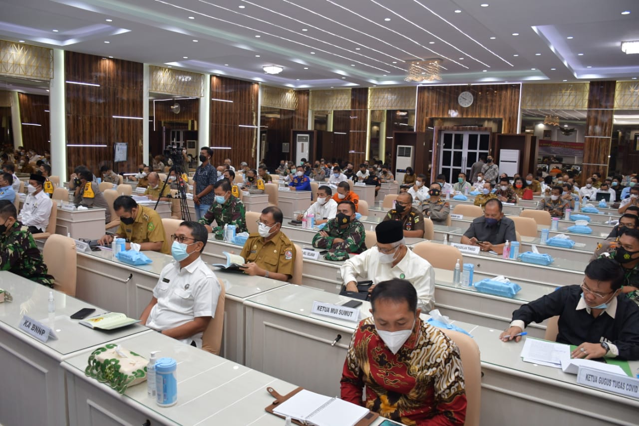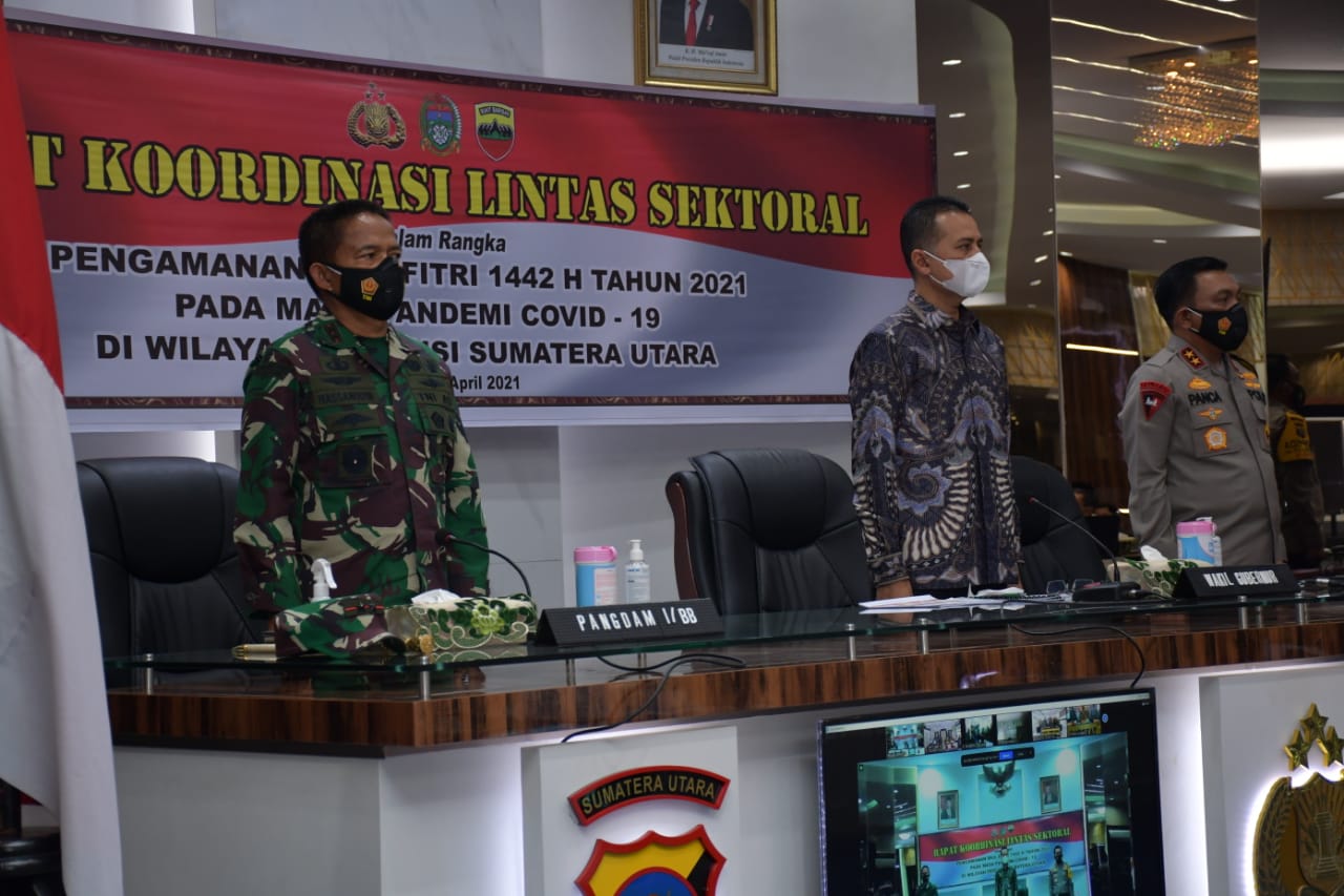 PORTALINDO.CO.ID, JAKARTA- Pangdam I/Bukit Barisan Mayjen TNI Hassanudin S.I.P, M.M., bersama Kapoldasu dan Wagubsu memimpin Rapat Koordinasi Lintas Sektoral untuk persiapan pengamanan dalam menyambut kegiatan Idul Fitri di Aula Catur Prasetya Mapolda Sumut. Selasa, (27/4/2021).