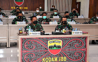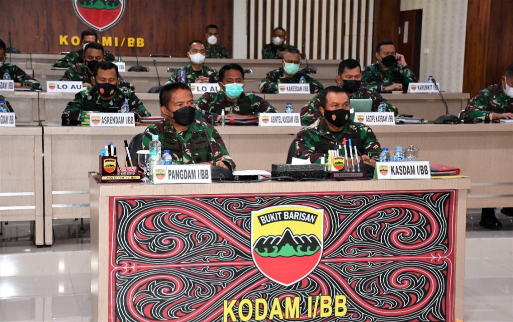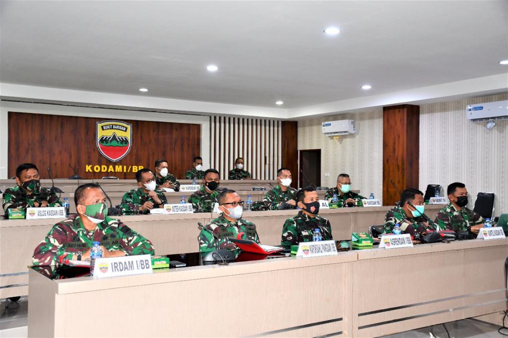Portalindo.co.id, Medan – Panglima Kodam I/Bukit Barisan, Mayjen TNI Hassanudin, SIP, MM, didampingi Kasdam I/BB, Brigjen TNI Didied Pramudito dan para PJU melakukan video conference (Vicon) dengan Panglima TNI, Marsekal TNI Hadi Tjahjanto, SIP, dari Puskodalops Lt II Makodam I/BB, Jln Gatot Subroto Km 7,5 Medan, Jumat (23/7/2021).
