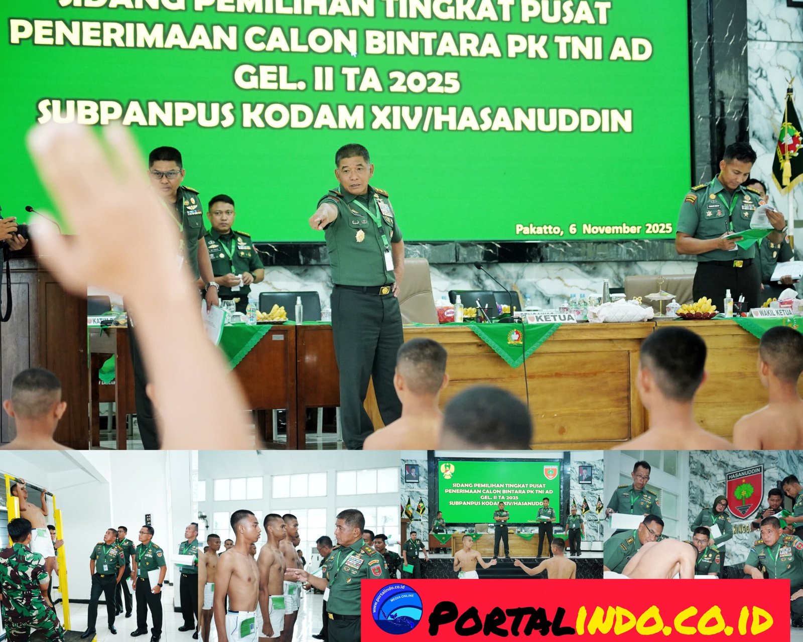 Portalindo.co.id | Gowa – Pangdam XIV/Hasanuddin Mayjen TNI Bangun Nawoko selaku Ketua Panitia Sub Panpus Kodam XIV/Hsn memimpin Sidang Pemilihan Tingkat Pusat Penerimaan Calon Bintara PK TNI AD Gelombang II TA. 2025, bertempat di Aula Rindam XIV/Hsn, Jl. Malino, Pakatto, Kab. Gowa. Kamis, (06/11/2025).