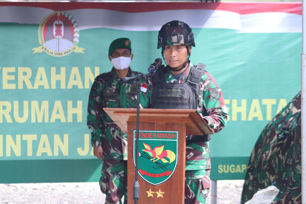 “Dengan telah selesainya pembangunan Rumah Dinas Kesehatan ini, maka atas nama Institusi TNI AD dan mewakili Bapak Kasad, saya selaku Pangdam XVII/Cenderawasih menyerahkan 6 unit Rumah Dinas Kesehatan kepada Pemda Kabupaten Intan Jaya,” jelas Pangdam.
