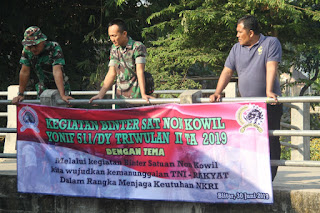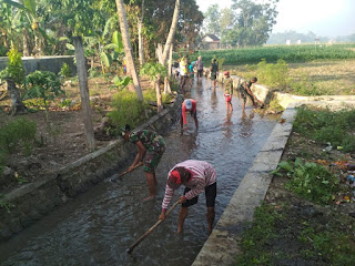Sejumlah personel Yonif 511/DY dan warga masyarakat kerja bakti membersihkan aliran sungai dari sampah, tumbuhan yang berada di sepanjang aliran sungai untuk mengantisipasi banjir dan kebutuhan air untuk pengairan sawah supata lancar bertempat di Kel. Klampok Kec. Sanan Wetan Kota Blitar, Minggu (30/06/2019)