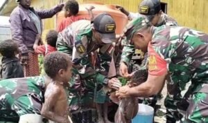 PORTALINDO.CO.ID | Babinsa Koramil 1703-02/Tigi Serka Suherma dan Serda Oktovianus Bersama Anggota Satgas 527/Braja Yudha ajarkan kepada anak-anak Papua pengetahuan tentang pola hidup bersih dan sehat. Dengan Rajin menggosok gigi, serta pola mandi setiap hari bertempat di Kampung Youmeni, Distrik Tigi, Kabupaten Deiyai, Papua Tengah, Selasa (25/6/2024).