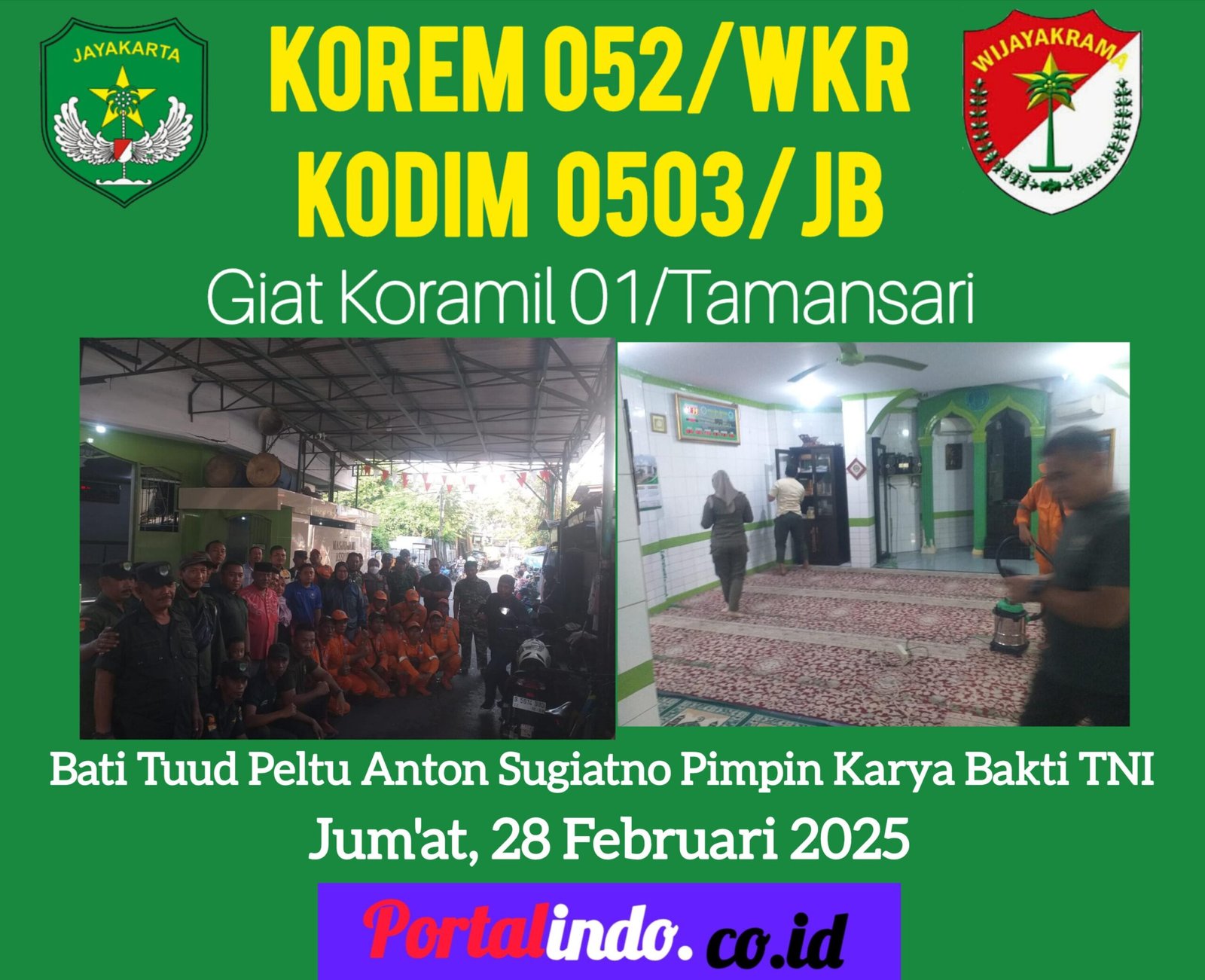 Portalindo.co.id | Kodam Jaya, Jakarta Barat _ Bati Tuud Koramil 01/Tamansari Kodim 0503/Jakarta Barat, Peltu Anton Sugiatno mewakili Pgs Danramil, Mayor Cpl Reka Kurniawan, S.I.P pimpin pelaksanaan giat Karya Bakti TNI bersama tiga pilar tingkat kelurahan dalam rangka menyambut bulan suci Ramadhan 1446 H tahun 2025 di wilayah binaan pada Jumat (28/02/2025).