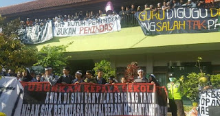 “Kami dibilang anak setan, apakah itu pantas diucapkan oleh kepala sekolah,” teriak seorang pelajar saat berorasi.