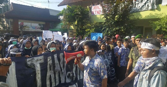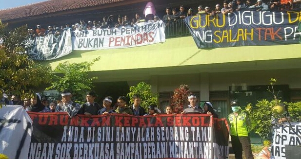 “Kami dibilang anak setan, apakah itu pantas diucapkan oleh kepala sekolah,” teriak seorang pelajar saat berorasi.
