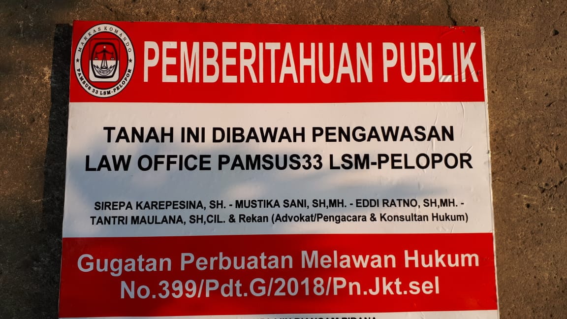 Portalindo.co.id,Jakarta – Setelahcukup lama menanti itikad baik dari pihak yg mengaku-ngaku sebagai pemilik tanah seluas +/- 4.450 M2 berlokasi di huk ujung jalan pertigaan lampu merah di Jl. Raya TMP – Kalibata/ Jl. Raya Pasar Minggu RT 006/ RW 007 Kel. Duren Tiga, Kec. Pancoran, Jaksel, yg diduga menggunakan “Surat Bodong” mengembalikan tanah tsb, dan menimbang setelah Tergugat I atas nama Aminah dipanggil dgn patut dua kali berturut-turut utk hadir dipersidangan PN Jaksel tdk datang, dan juga setelah mengirimkan Surat Pemberitahuan kpd Instansi terkait yg berwenang, M. Napis Bin H. Asmuni Bin H.M. Zen (Penggugat) diwakili Kuasa Hukumnya dari TEAM PAMSUS 33 LSM-PELOPOR hari ini memasang plank pemberitahuan publik mengenai status tersebut secara terbuka mengenai Status Tanah tsb secara terbuka, agar tanah tsb tdk kembali diganggu/ dikuasai/ digunakan pihak-pihak yg tidak bertanggungjawab dgn berbagai cara yg melawan hukum.