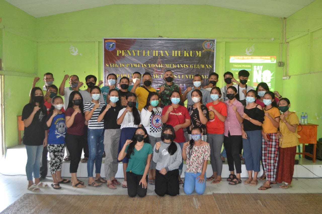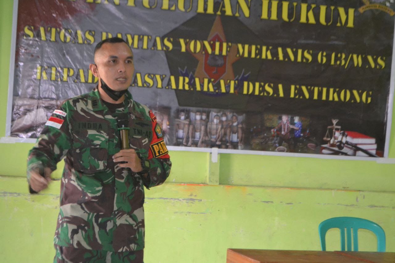 Portalindo.co.id, Sanggau, Kalbar – Perwira Hukum Satgas Pamtas Yonif Mekanis 643/Wns Kapten Chk Indra Ismana,S.H memberikan penyuluhan hukum kepada masyarakat Desa Entikong, Kabupaten Sanggau bertempat di gedung pertemuan Dusun Sontas, Entikong pada hari Minggu (13/06/2021).