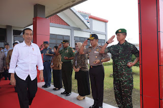 Kedatangan Presiden Joko Widodo di sambut Komandan Kodim 0703/Cilacap Letkol Inf Yudi Purwanto beserta seluruh unsur Forkopimda Kabupaten Cilacap, dampingi Pangdam IV/Diponegoro Mayjen TNI Wuryanto dan Kapolda Jateng Irjen Pol Condro Kirono M.M., M. Hum, sambut kedatangan Presiden RI Joko Widodo di Bandara Tunggul Wulung Cilacap, Senin (23/04/18)