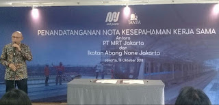 Portalindo.co.id, Jakarta- PT. MRT Jakarta dan Ikatan Abang None Jakarta (IANTA) menandatangani Nota Kesepahaman terkait promosi dan edukasi tentang MRT Jakarta, di kantor pusat Wisma Nusantara, Jakarta Pusat, Jumat Sore (19/10/2018).