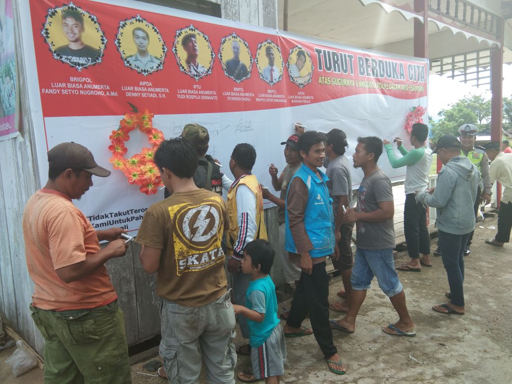 Morowali – Ratusan masyarakat di Kabupaten Morowali Utara (Morut) Provinsi Sulawesi Tengah (Sulteng) melakukan aksi penandatangan turut berduka cita kepada enam anggota polisi yang gugur saat bertugas dalam aksi terorisme.