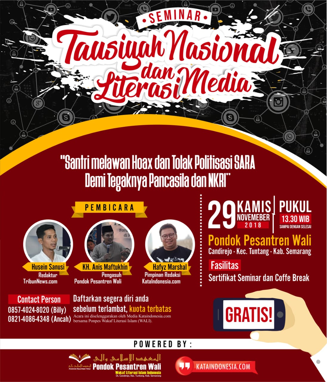 “Kami warga santri dan mahasiswa serta masyarakat Se-Salatiga, dengan ini menyatakan menolak segala berita bohong atau hoax serta sentimen bermuatan suku, agama, ras, dan antar golongan,” kata Hafyz Marshal selaku ketua pelaksana acara dan pimpinan redaksi kataindonesia.com.