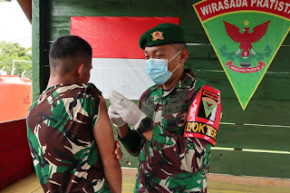 PORTALINDO.CO.ID, JAKARTA – Mendukung program pencegahan penyebaran Covid-19 dan mewujudkan kondisi imun prajurit TNI AD yang kuat dan sehat, personel Satgas Pamtas RI-PNG Yonif 403/Wirasada Pratista mendapatkan suntikan vaksin tahap ke dua.